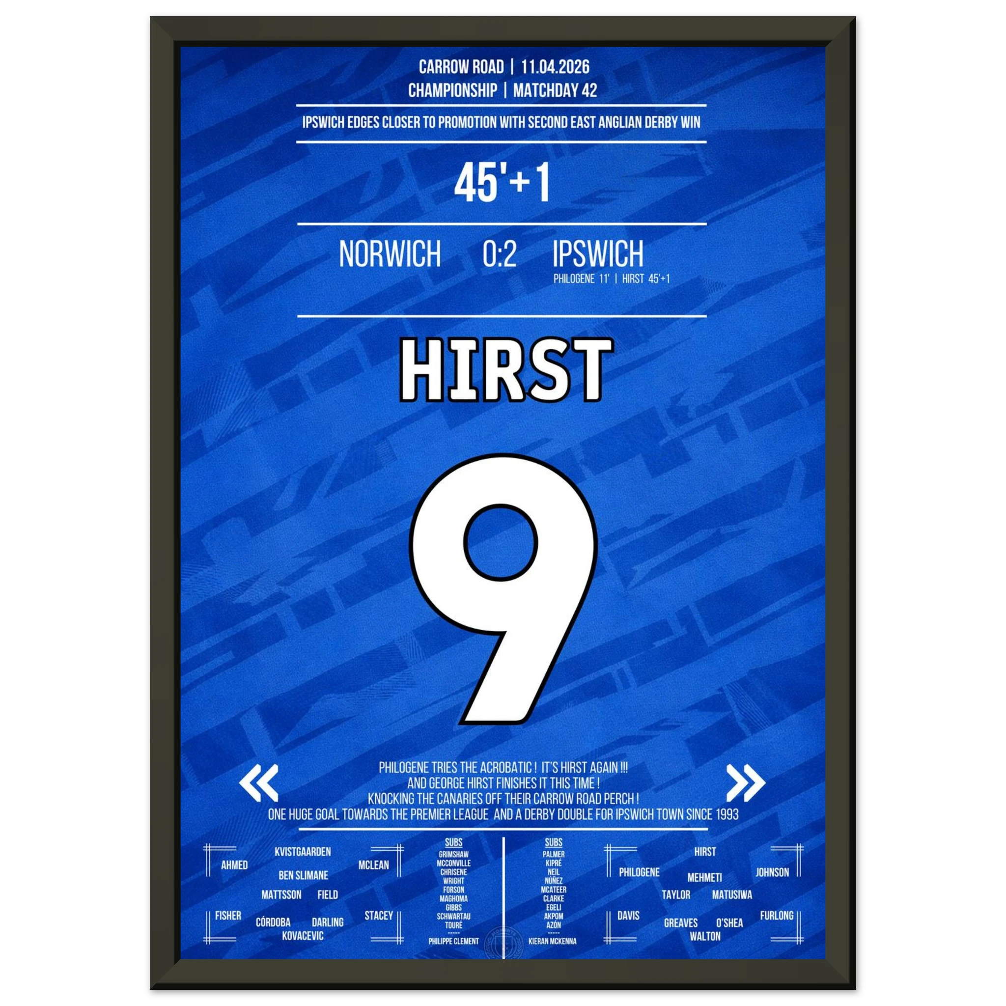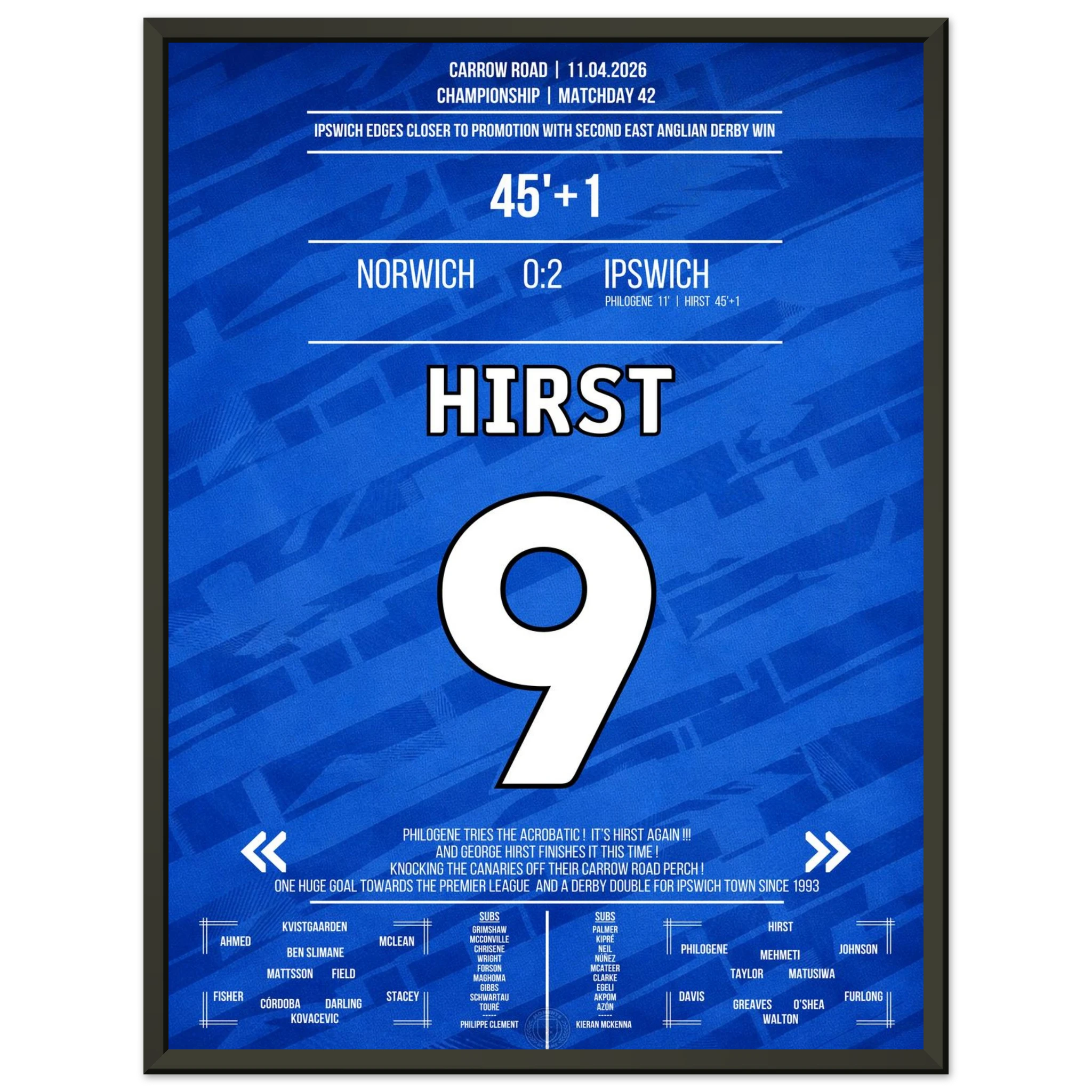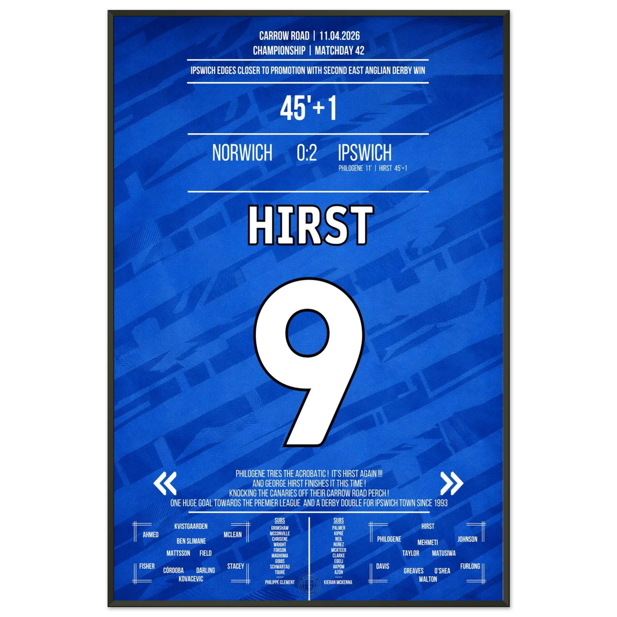 We design high-quality posters of unforgettable football moments – in the club colours, with match information and iconic style. For fans who want to bring goosebump moments to their walls.