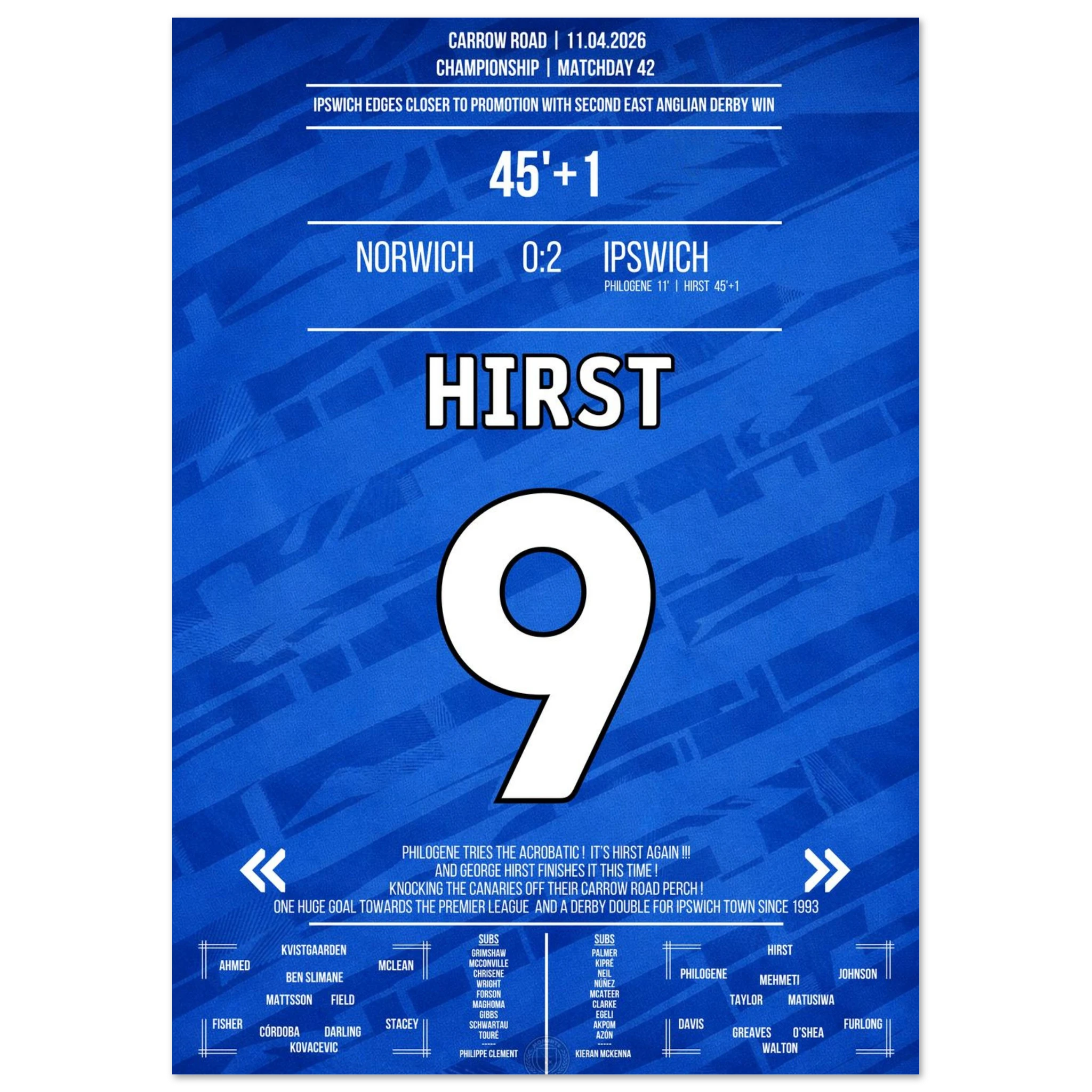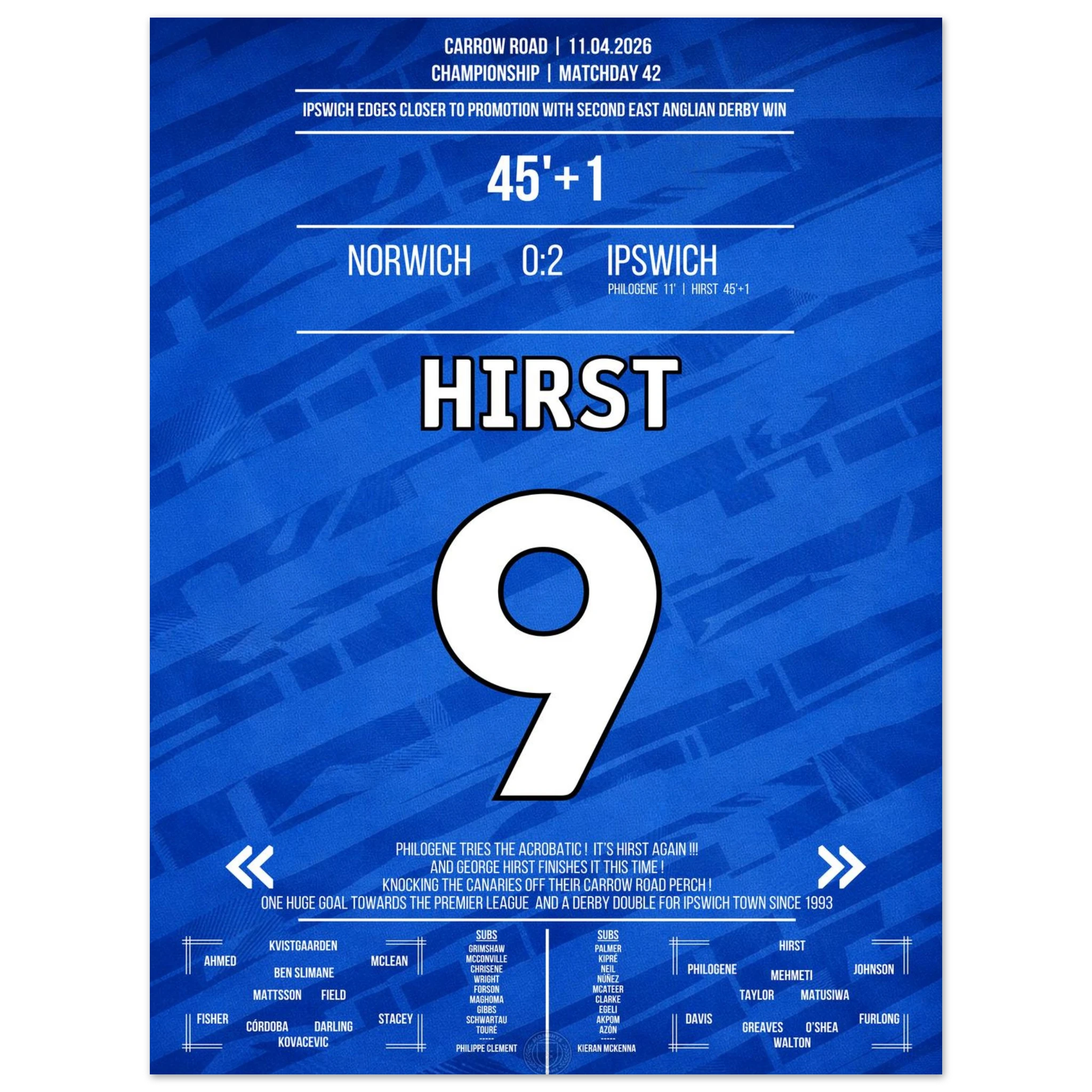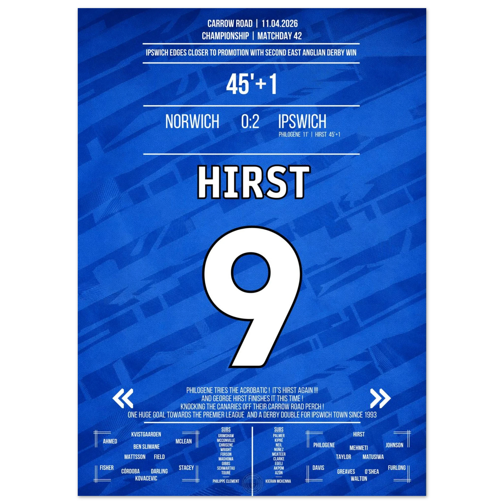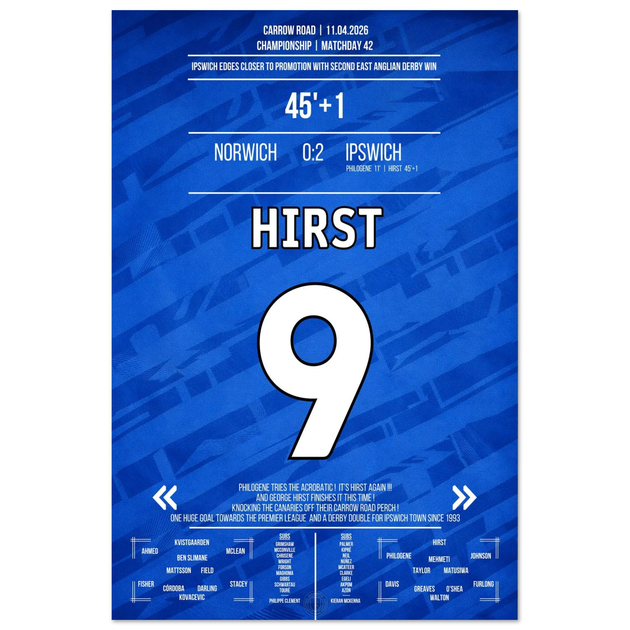 We design high-quality posters of unforgettable football moments – in the club colours, with match information and iconic style. For fans who want to bring goosebump moments to their walls.