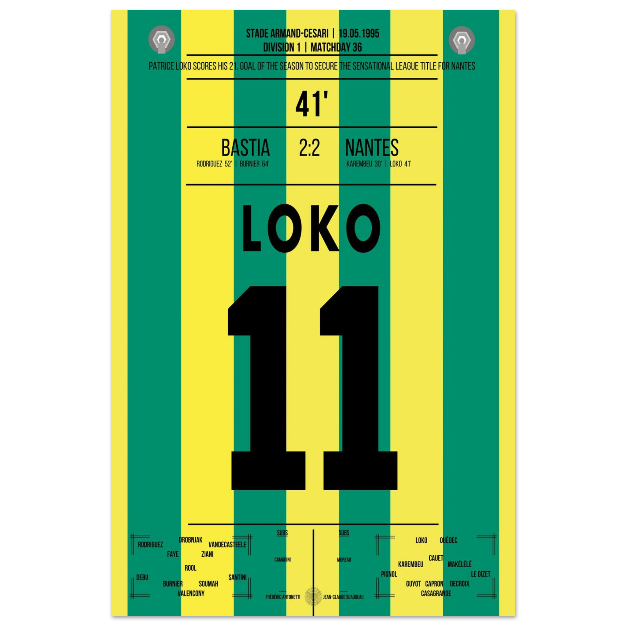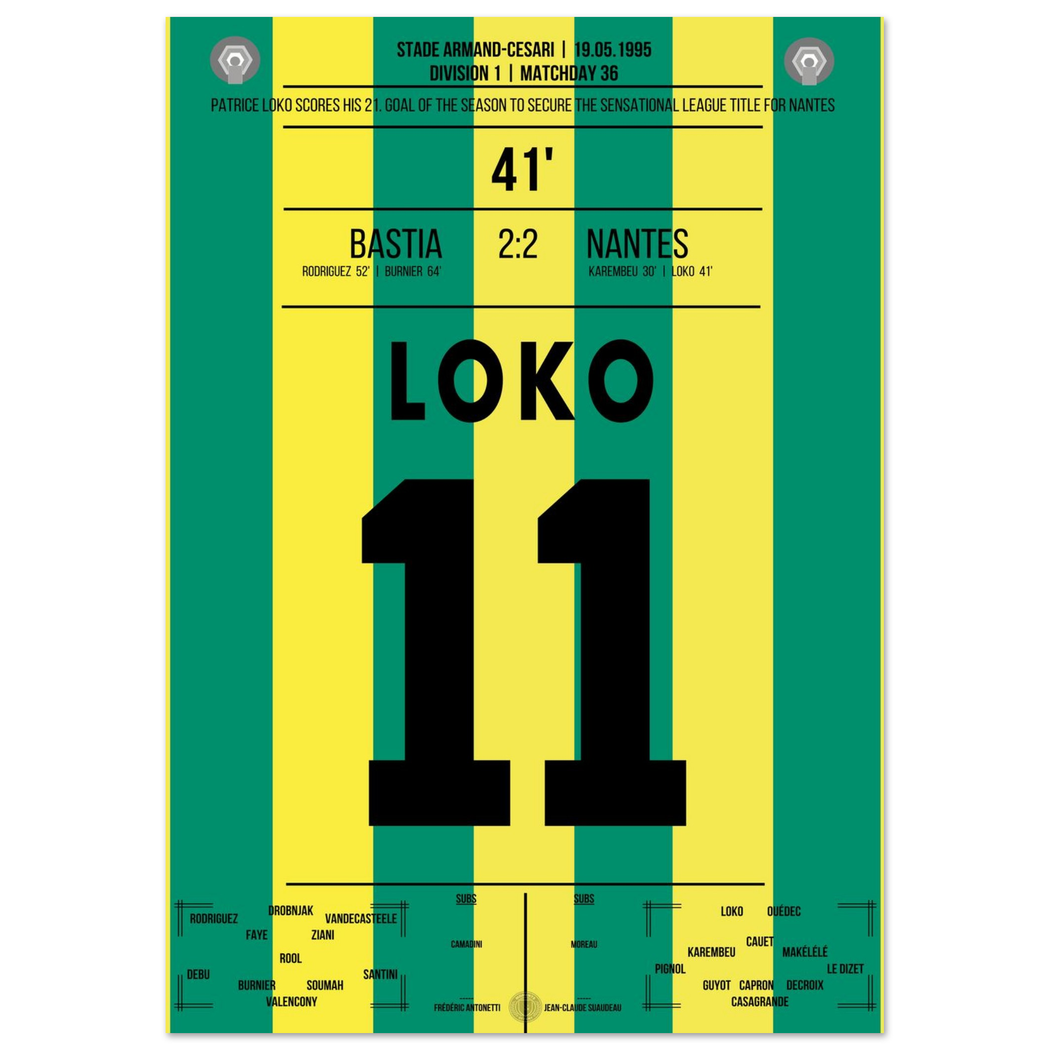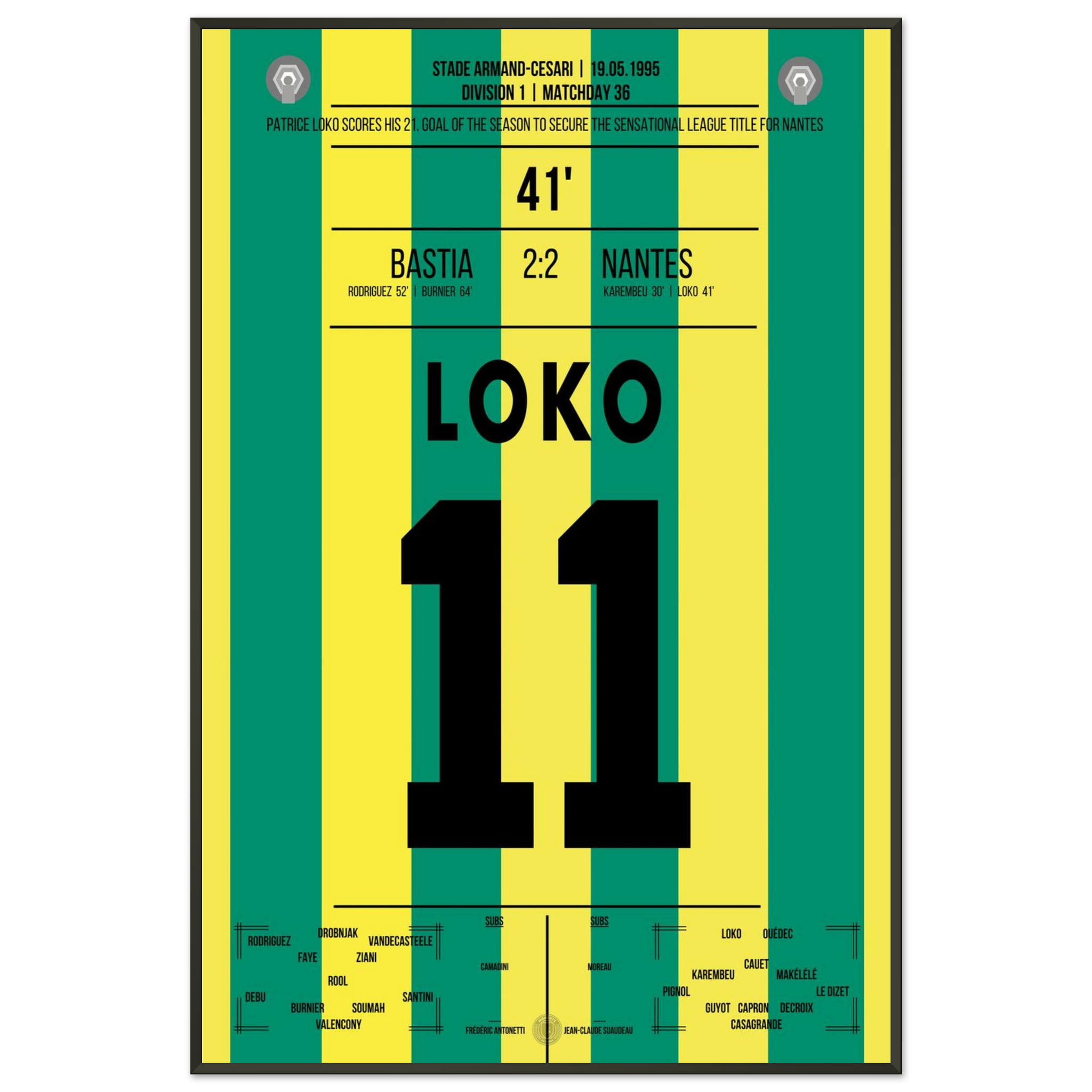 Ein Abend für die Geschichtsbücher: Patrice Loko erzielt den entscheidenden Treffer, der Nantes nach einer überragenden Saison den Meistertitel sichert – ungeschlagen in 32 Spielen!